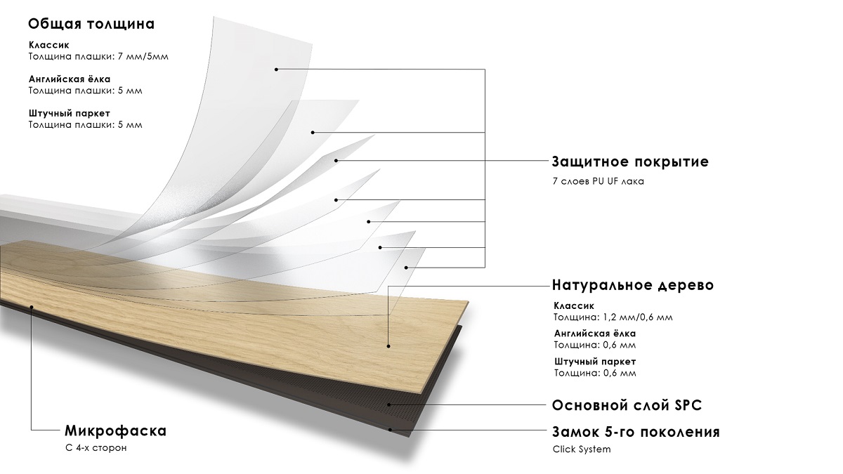 Высочайшую прочность кварцпаркету придаёт каменно-полимерная основа, которая стабилизирует деревянный слой. Сверху ценный шпон покрыт грунтовкой и 7 тонкими слоями лака — это защищает от внешних воздействий: ударов, царапин, сколов.
