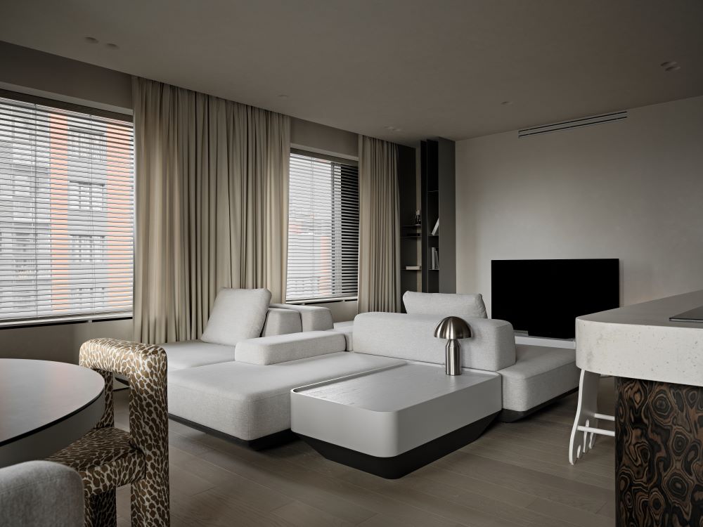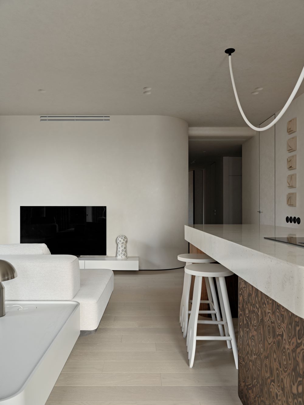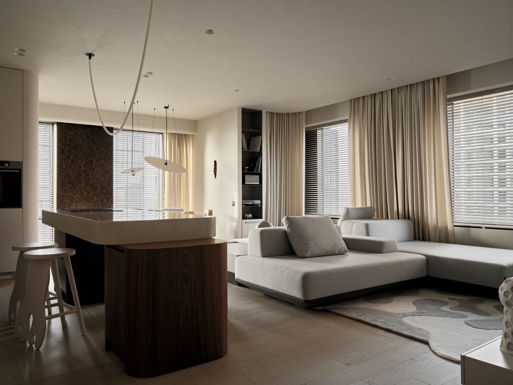 Основная задача — сохранить планировку, но полностью изменить ощущение пространства с помощью мягкой геометрии, продуманного света и правильных материалов.